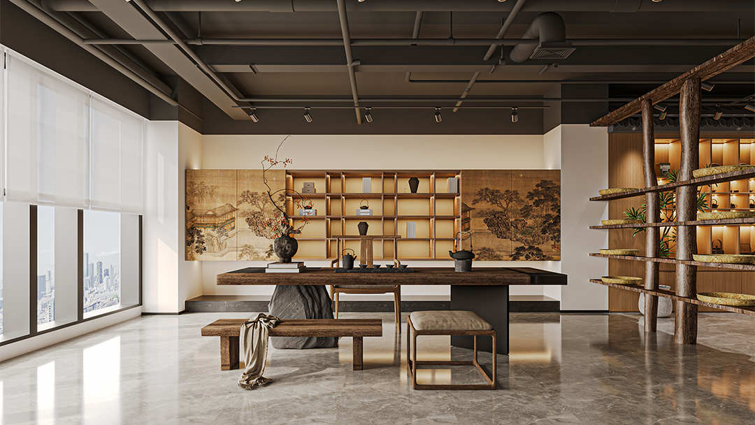 設(shè)置開放式點(diǎn)茶區(qū)、私密包廂及景觀庭院,例如大廳以抬高地臺劃分主客位序,包間融入榻榻米茶席與獨(dú)立枯山水造景,動線設(shè)計(jì)參考《清明上河圖》的街巷邏輯,引導(dǎo)顧客沉浸式體驗(yàn)宋人雅集。