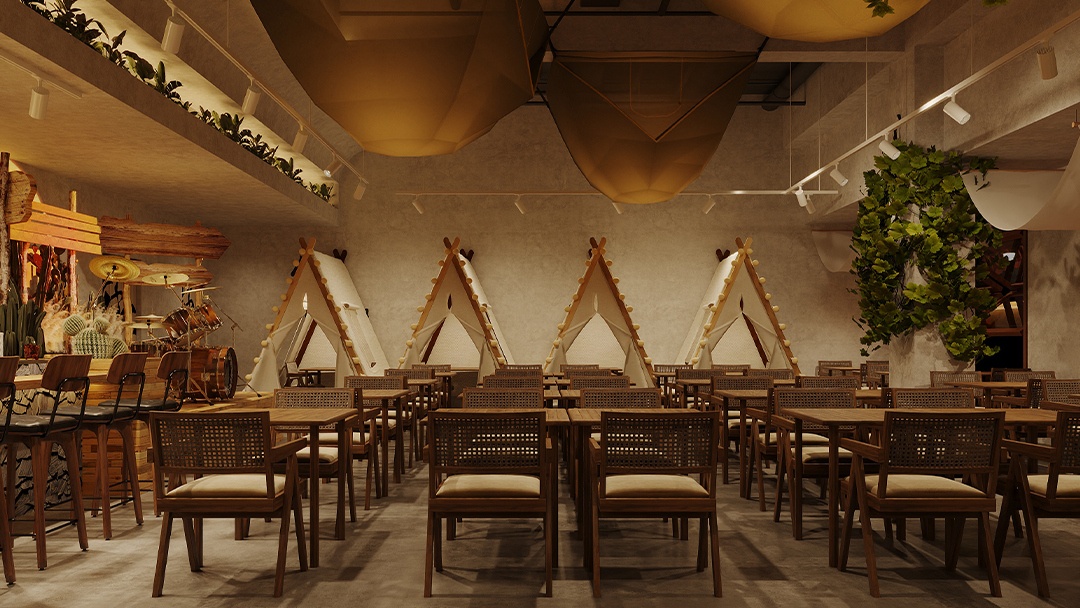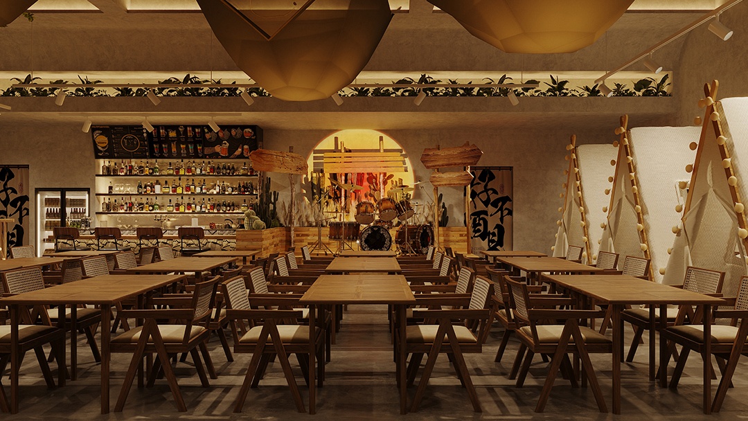 杭州露營(yíng)風(fēng)戶外酒吧裝修設(shè)計(jì),本案以“都市曠野聚落”為概念,將山系美學(xué)植入城市夜生活。空間鋪陳礫石地與仿真草坪,搭配復(fù)古煤油燈串與天幕系統(tǒng)。中心區(qū)域架設(shè)篝火裝置與折疊椅環(huán)座,吧臺(tái)由改裝露營(yíng)車箱體構(gòu)成。墻面運(yùn)用防銹鋼板與回收木料,嵌入戶外裝備展示架與多功能電源接口。頂部懸掛星空投影網(wǎng),結(jié)合隱藏式取暖設(shè)備與驅(qū)蚊系統(tǒng),營(yíng)造全天候可用的沉浸式戶外社交場(chǎng)景。