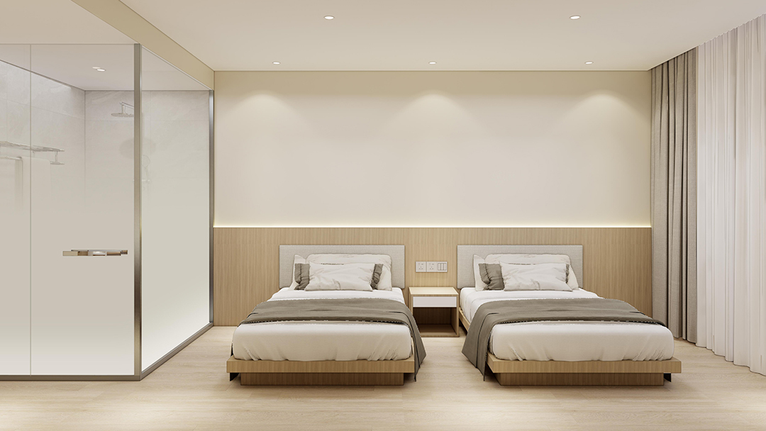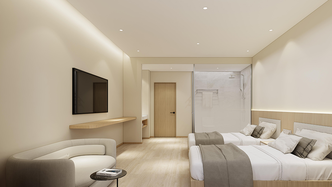 杭州極簡風酒店裝修設計,以極簡與輕工業(yè)風為設計核心,采用天然褐色原木與灰色砌磚營造質樸氛圍,外立面大面積落地玻璃引入自然光,實現古樸與現代的交融。室內以幾何線條分割功能區(qū),如鏡面玻璃走廊延伸空間感;客房內暖黃原木與冷灰淋浴玻璃形成視覺對比,頂樓保留裸露木質屋頂,搭配鋼結構閣樓提升實用性,盡顯極簡設計中的精致巧思。
