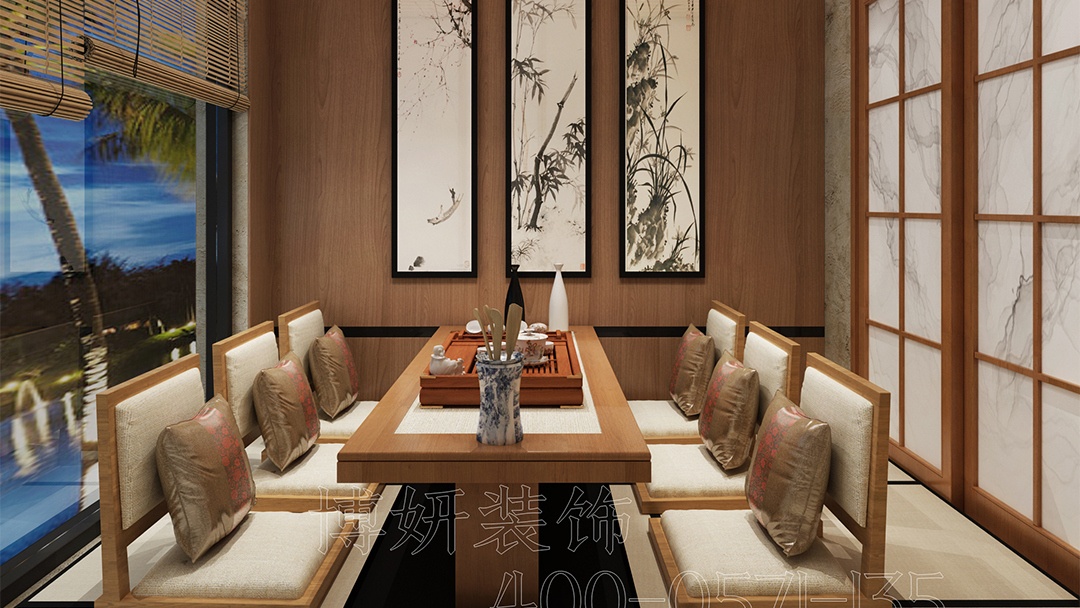 • 材質(zhì)與氛圍:選用原木、竹編、素色涂料等天然材料,搭配暖黃燈光與庭院枯山水造景,營造靜謐雅致的用餐環(huán)境。
