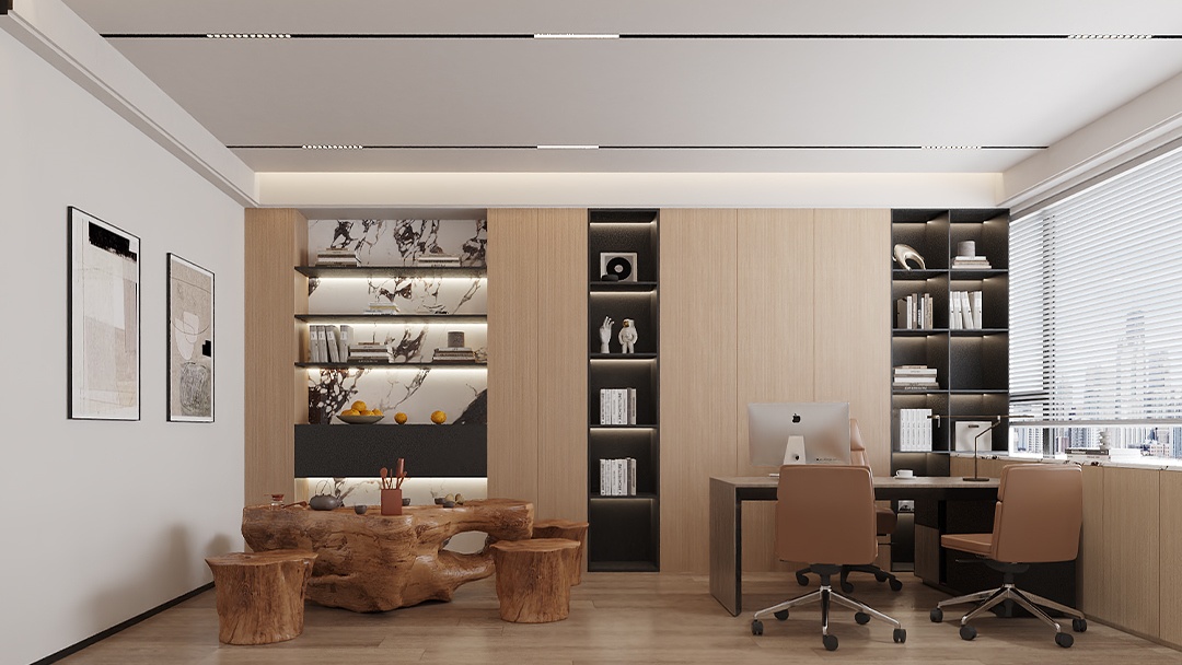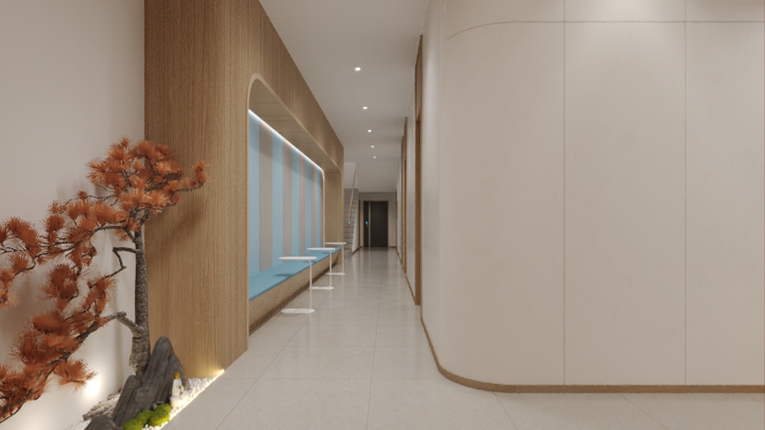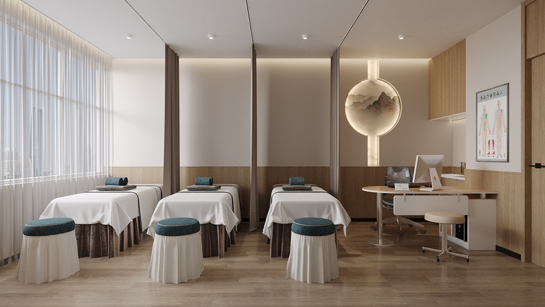 杭州新中式中醫(yī)館裝修設計,本案以“承古煥新”為理念,將江南文人精神與中醫(yī)“天人合一”哲學相融合??臻g以胡桃木格柵與素色麻布為基底,藥柜區(qū)采用銅件包邊的百子柜陣列,配以隱形LED燈帶突顯藥材質(zhì)感。候診區(qū)引入天井景觀,設置枯山水與藥用植物盆栽,營造靜心氛圍。診療室采用可移動宣紙屏風分隔,墻面嵌入經(jīng)絡穴位發(fā)光示意圖,整體以溫潤材質(zhì)與克制用色,構(gòu)建既有文化認同感又符合現(xiàn)代診療效率的療愈空間。