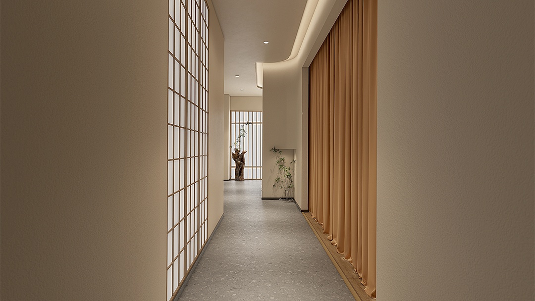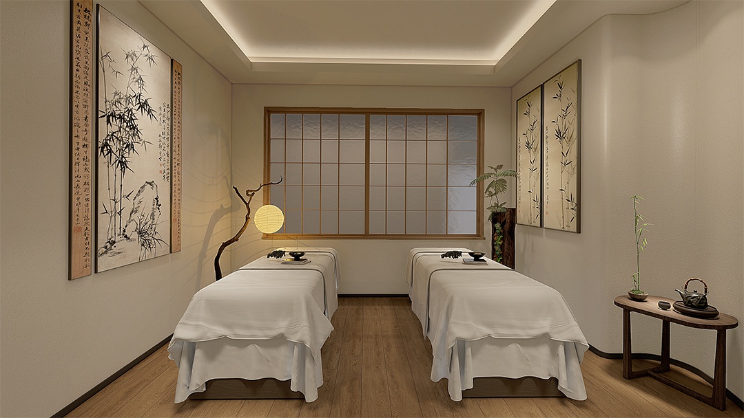 杭州新中式推拿館裝修設(shè)計(jì),融合東方美學(xué)與現(xiàn)代舒適需求??臻g以淺灰墻面與原木格柵構(gòu)筑雅致基底,理療區(qū)采用可升降中式榻榻米床榻,搭配鏤空花窗隔斷與可調(diào)角度射燈。墻面嵌入動(dòng)態(tài)山水紗幔投影,背景音效模擬溪流鳥鳴。草藥熏蒸區(qū)以銅制云霧裝置呈現(xiàn)可視化蒸汽理療,整體以麻織品、竹編與溫石材質(zhì)點(diǎn)綴,營(yíng)造身心同息的沉浸式調(diào)理場(chǎng)景。
